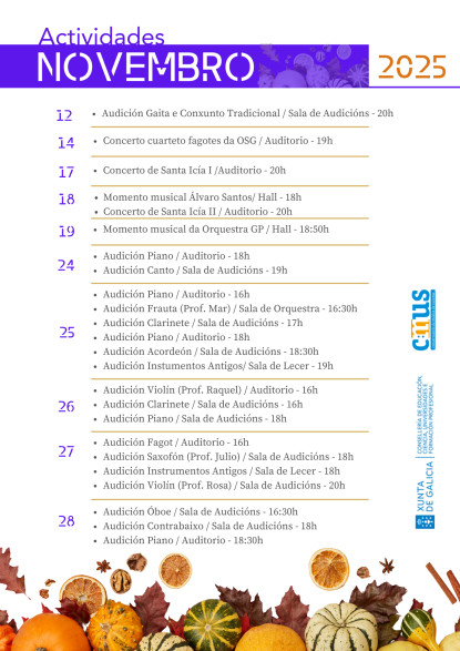 Este mes de novembro ven cargado de actividades!! Santa Icía, Concerto de Fagotes da Sinfónica de Galicia, as Audicións do 1º trimestre... Así que atentos e atentas que arrancamos xa o mércores 12!!